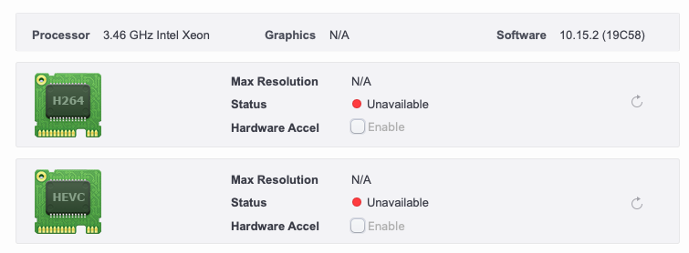 My system is 2009 4.1>5.1 MacPro. AMD Rx580 GPU, dual 3.46 CPU. I took all the drives out except one SATA mounted SSD that was formated clean with a brand new install of 10.14 in order to experiment with HW acceleration.