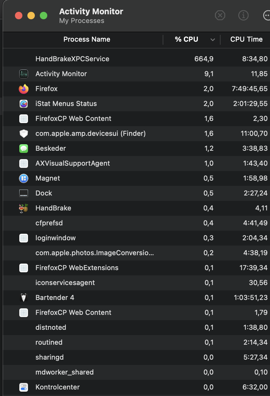 Was doing a handbrake encoding today and the process does not seem to be showing up correctly in activity monitor/at all, please see images, previously on my old intel computer it displayed perfectly fine. Any ideas?