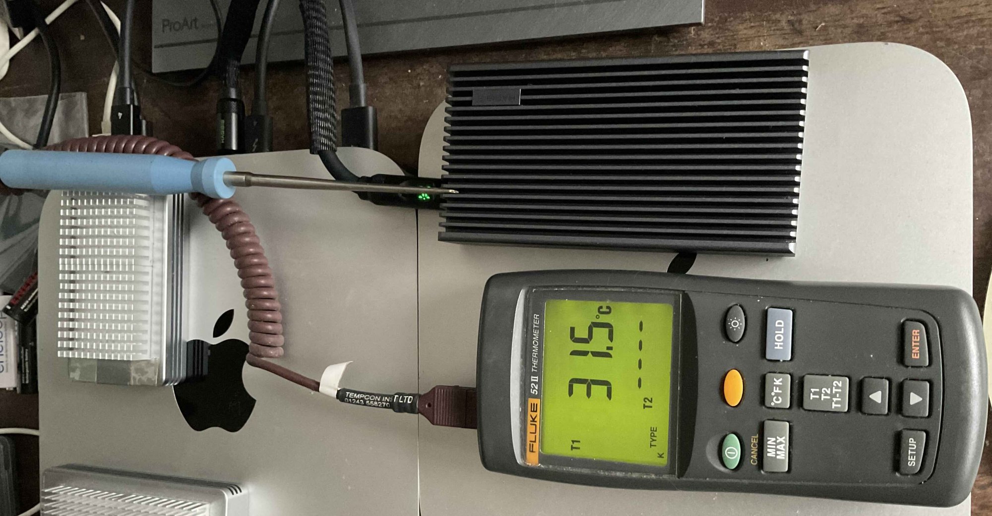 Like many of us, I've been unsure exactly *which* NVME-enclosure sensors are being reported by utilities such as TG Pro/Drive DX & etc; so wedged a 'Type K' sensor into the fins of a HAGIBIS MC40, containing a 990 Pro 4TB, idling halfway though the day's work while drawing about 5W. This Fluke 52 2 thermocouple thermometer is accurate to within about 1.5 degree C.