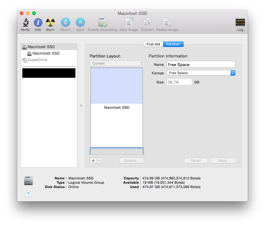 I had two partitions on my SSD (Named Macintosh SSD): Macintosh SSD (Main partition) and Yosemite (For the public Beta). After updating to Yosemite on the partition Macintosh SSD, I deleted the Yosemite partition using Disk Utility. Now, I have only one partition on my SSD, the Macintosh SSD partition. My problem is that I now have 36GB of space that I cannot add back to my main partition (where the Yosemite partition was)! Can anyone help me? (Please see attached pictures)
