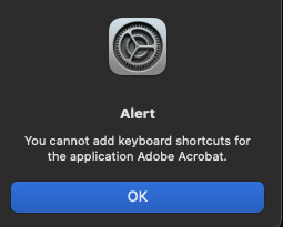 Apple allows users to define keyboard shortcuts for just about any command in a menu (if you spell it exactly right). You will see the shortcut displayed next to the command in its menu. For example, I use control-option-commmand+up-arrow to move a window to the upper monitor and the same with down-arrow to move it down. Tends to work like a charm — unless you are using Acrobat Reader DC, that is. Those keyboard shortcuts do not display when Reader DC is being used. No other app I use does this. Very annoying as I have to use Reader DC daily. I think this is a bug in that the app is not paying attention to something in the OS that it should be. Right?