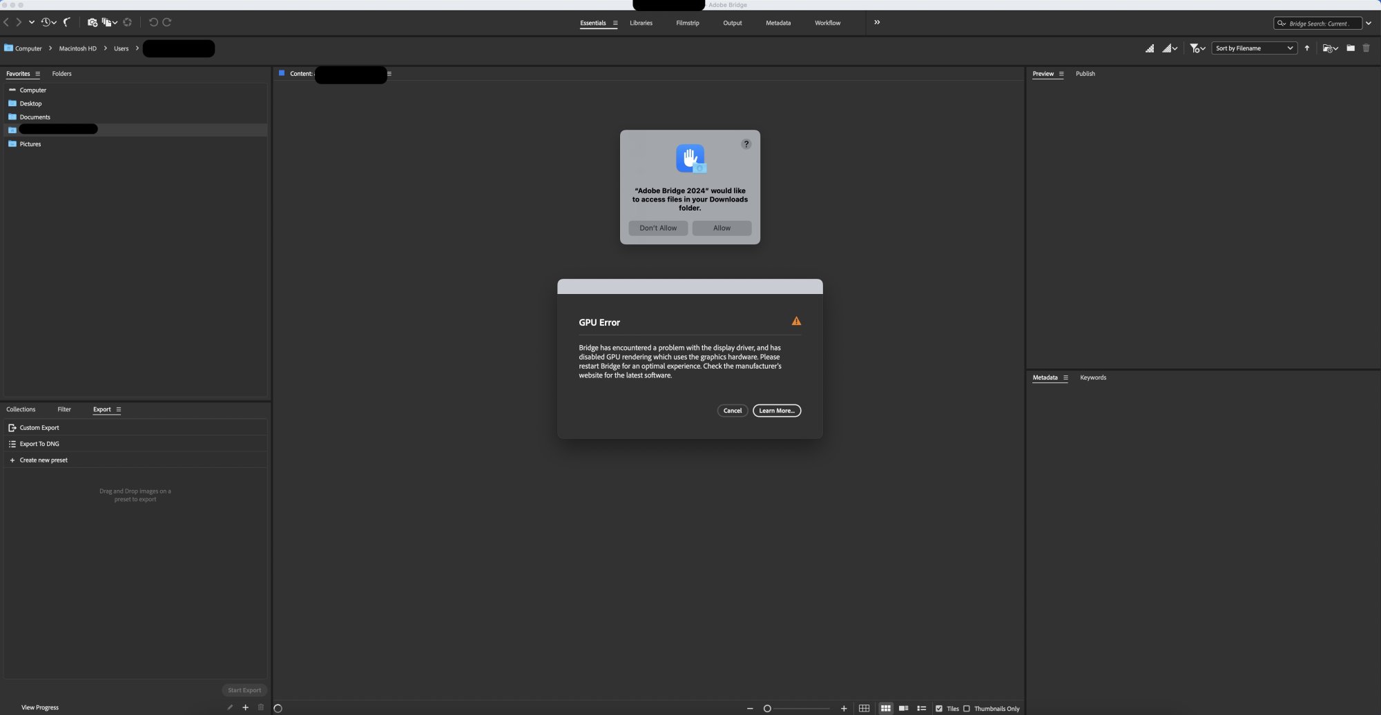 C chama98 macrumors 6502 Original poster Feb 13, 2014 386 231 London Jun 16, 2024 #1 Been using bridge under the new OS beta 1. Been experiencing this. I was messing around with photos on my 2nd Mac. (not for working or School etc) Feedback sent to Apple and Adobe. I am using a Mac mini M1 with 8GB and 256GB HHD Attachments Screenshot 2024-06-16 at 17.18.21.jpg 91.4 KB · Views: 146