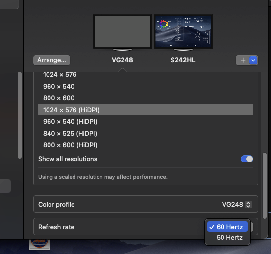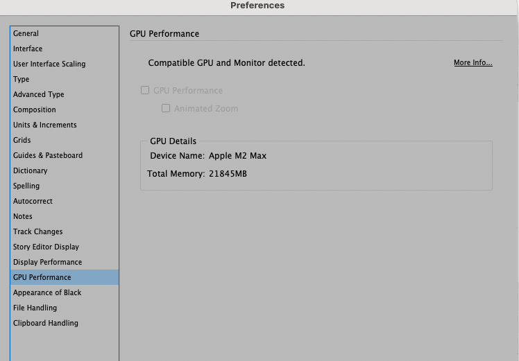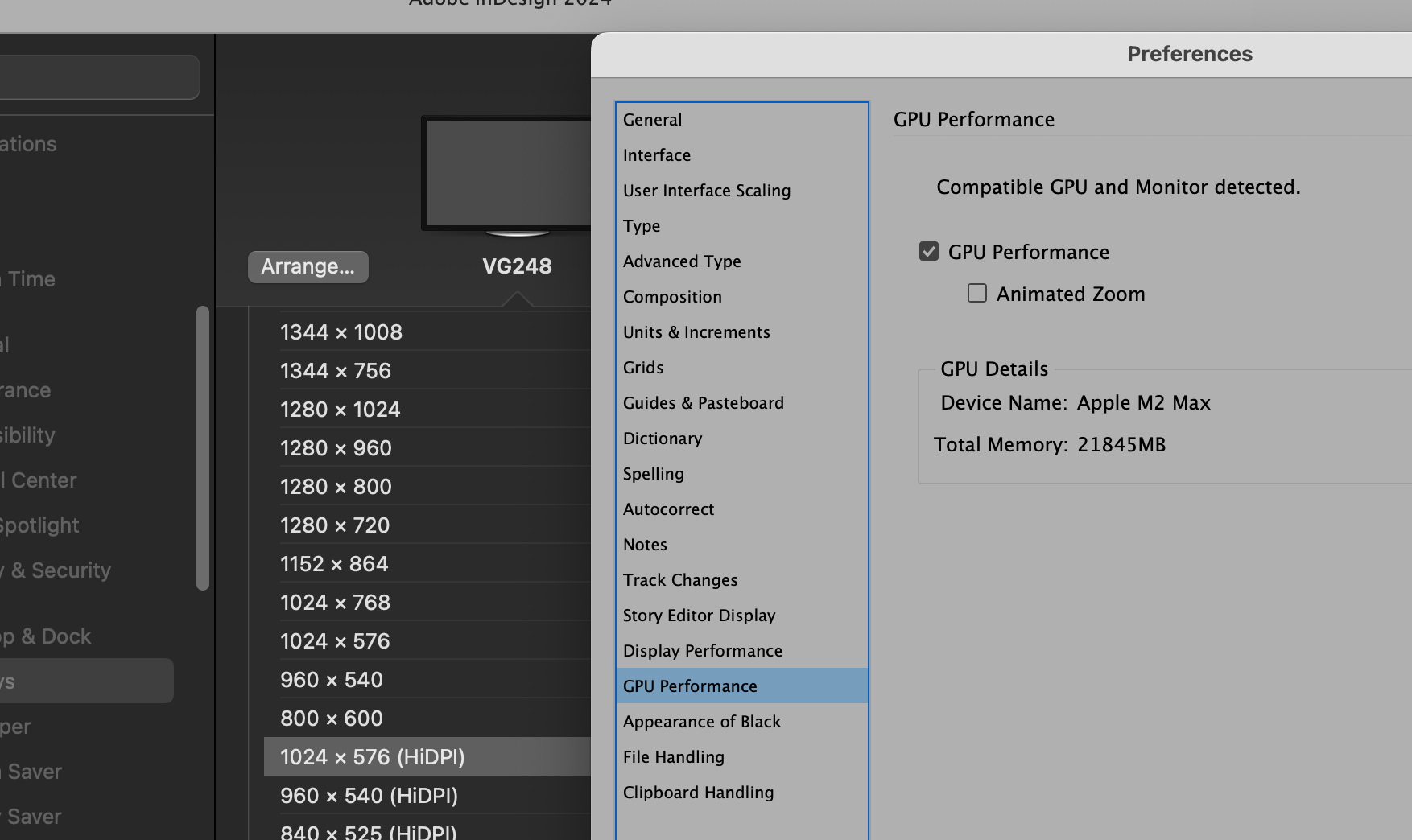 Hi, I have a Mac Studio 2023 M2 and a MacBook Pro M2 and a Mac Pro 2013. The problem is more of an annoyance but it does affect screen display of type boxes as well adjusting and moving picture boxes on pages and does become problematic when ID files are on the larger size. My Studio will not give an option to use the GPU performance in ID Preferences, it remains grey. What I have tried is changing cables, changing monitors, Changing monitor resolution to an HiDPI resolution and then back again, ( saw posts in google searches referring it to be a monitor issue, So I exhausted every one I found ). Following a few of them carefully, I was unable to get it to work. I first had my main monitor hooked up BWO the monitor Display port using an usb-c adapter designed only for video plugged into the back of the Studio, trying all the available frame rate the display pot offered, which went as high as 144hz. Tried the suggestions online again, regarding the resolutions. Then I switched from Display port for the HDMI port on the monitor, plugging it directly into the HDMI of the Studio, No luck there either, Tried the resolution thing again, still no good.