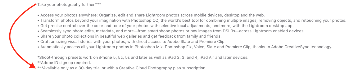 For those unfamiliar with Lightroom, it is Adobe's professional-level photo editing software. Lightroom for iOS devices is a free download, but because it is designed to work alongside the Lightroom app for the desktop, it requires a subscription to Adobe's Creative Cloud Photography plan, priced at $9.99 per month. A 30-day free trial is available.- New: Full resolution output. Now, export and share photos that were captured on your device or that you added to your device at full resolution.