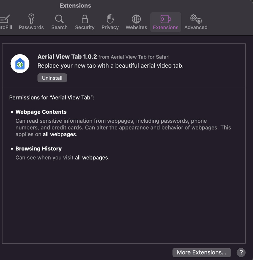 I have no idea what you installed but this is definitely NOT "my" Aerial.No. Not a third party. The warning is right in the Safari extensions panel when you install it.