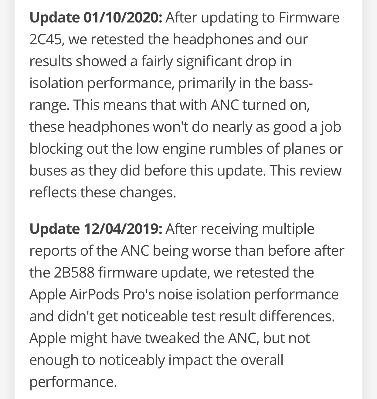 RTINGS published its findings today and does confirm that the 2C54 firmware objectively worsens the AirPods Pro active noise canceling feature:The news is not all bad, however. In other areas of testing, the 2C54 Firmware appears to improve performance in frequency response and bass accuracy. Note: RTINGS incorrectly refers to the firmware as version 2C45, not 2C54.