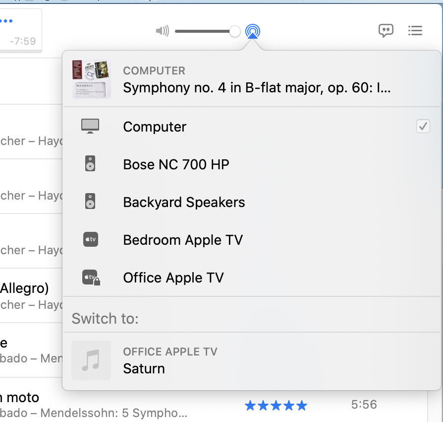 What I discovered is that if I select the headphones from THIS menu, the sound quality improves to what is expected, and sounds exactly like it does through the iPhone. Switch it back to "Computer", and the sound is degraded again. I then tried this with my AirPod Pros, and they behave the same... degraded sound quality when the Music app is set to "Computer" (and the AirPod Pros are the systemwide output device), noticeably better quality when I select the AirPod Pros from the Music app output menu.