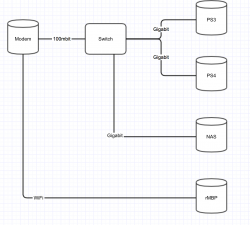 You might immediately spot the problem: In order to get from my NAS to my rMBP, the data has to travel first through the switch, then onto the router (which kills the transfer rate due to going from Gigabit to Megabit), then wirelessly to my laptop.