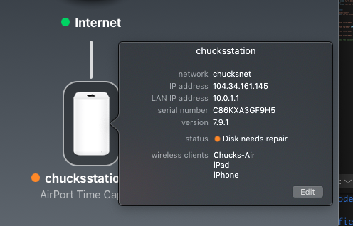 I want to move files from my Apple Airport Extreme 2TB drive to a newly purchased Sandisk extreme portable SSD (model SDSSDE61-1T00). But when I plug the drive into the back of the Airport Extreme the utility app shows the image below "disk needs repair" in orange.