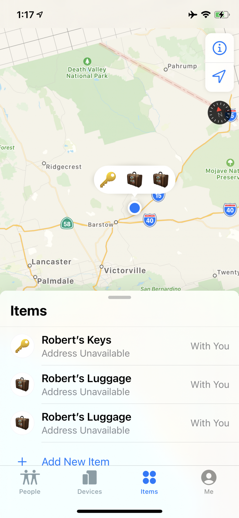 We took off, somehow the Internet was open on this flight and Find My showed this (Imagine the map moving quite quickly). Somehow my phone was actually able to ping the bags in the hold below my feet.