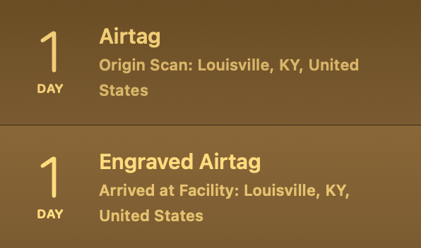 Yes. Mee too. Airtags shipping via UPS and keychain via FedEx. Both arriving tomorrow.Quick update. Got an email from Fedex now that I have a package coming tomorrow from Apple in TN. Pretty sure it's the keychains and the one from UPS (engraved), which is scheduled for tomorrow. Lets see as Apple still says May 6.