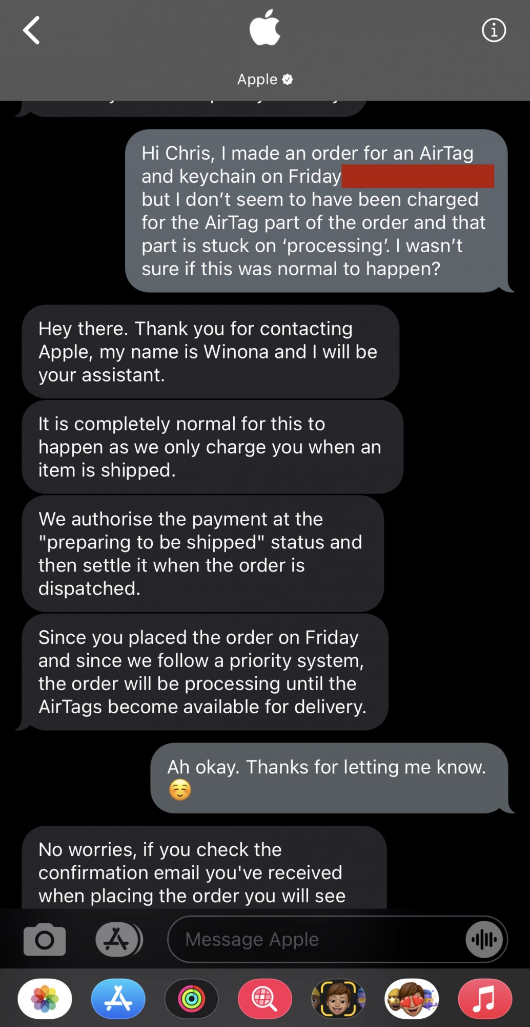 I've just rung Apple and the customer service person said that it was a known issue with AirTag orders. He said their technical team were 'fixing it'.