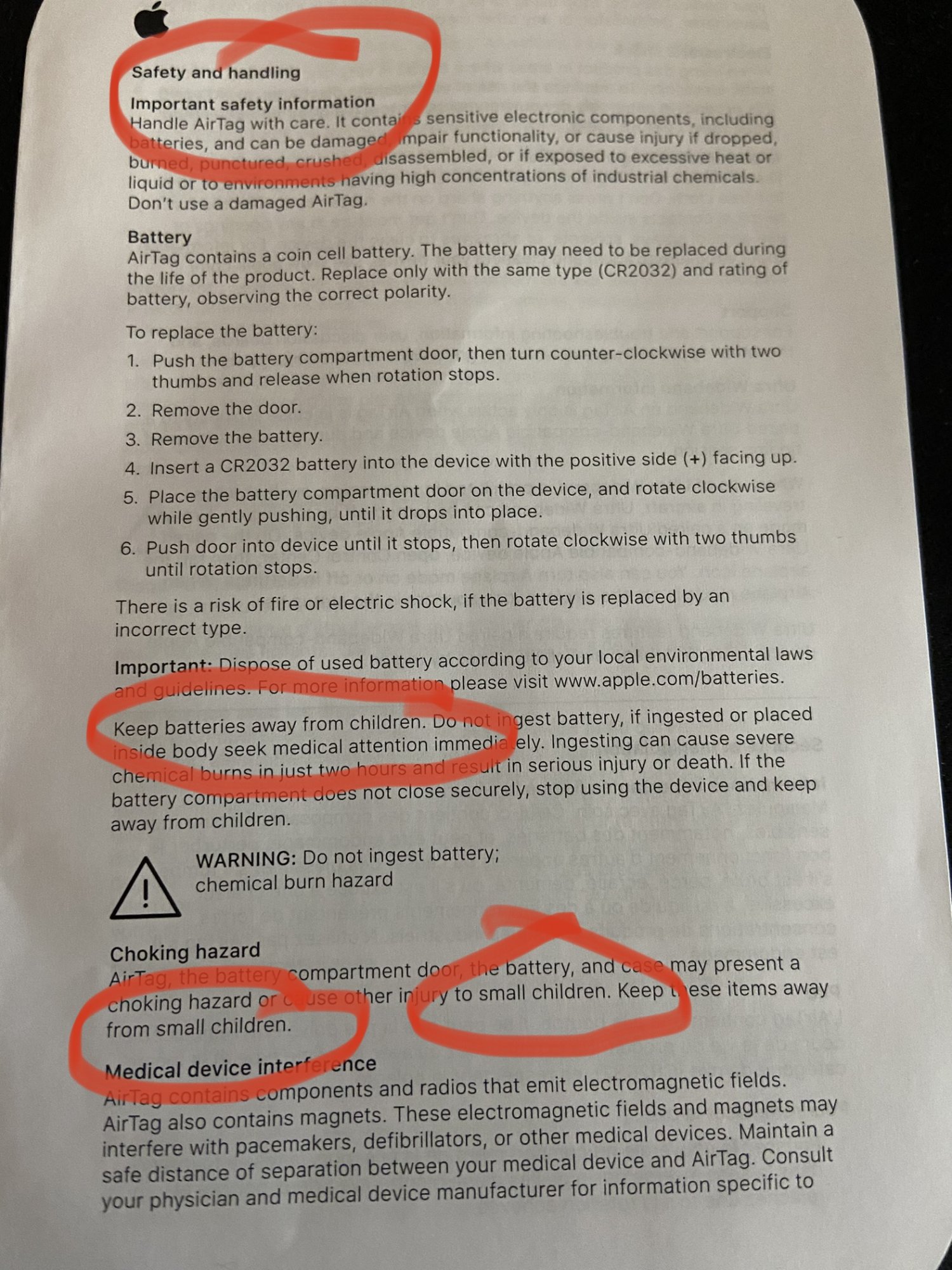 There is a much higher risk of your child getting hold of your AirTags at home than someone else's. I personally wouldn't be all that worried about that as I feel the risk would be exceptionally low. I don't particularly worry about other similar devices that have the same flaw that belong to other people as my childrens' window of opportunity to do serious self harm is very limited.Completely flawed logic since by their very nature Airtags bought by other people are likely to turn up all over the place.