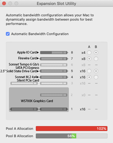Yes the Sonnet card in slot 4 has (4) 1TB Samsung 970 EVO Plus NVMe modules in RAID O.It doesn't really matter since you usually won't be using all devices in Pool A at once (four NVMe devices on the Sonnet 4x4 and the FireWire card). Are the NVMe devices in a RAID 0? If not, then they are definitely not going to be used at the same time.