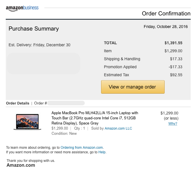 - What price did you end up with for that machine, if you don't mind?"We're contacting you about order #xxxxxxx for Apple MacBook Pro MLW82LL/A 15-inch Laptop with Touch Bar (2.7GHz quad-core Intel Core i7, 512GB Retina Display), Silver. We recently learned that an error caused this item to be displayed at an incorrect price.
