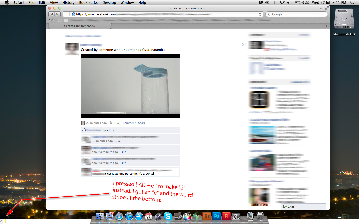 I pressed [ Alt + e ] to make "é", but instead, I got this weird stripe at the bottom of the screen, behind the dock, with the accent I wanted to put on the "e" appearing in the box. There was even a red close button to close the weird stripe, as if it was some kind of "language bar" or whatever.