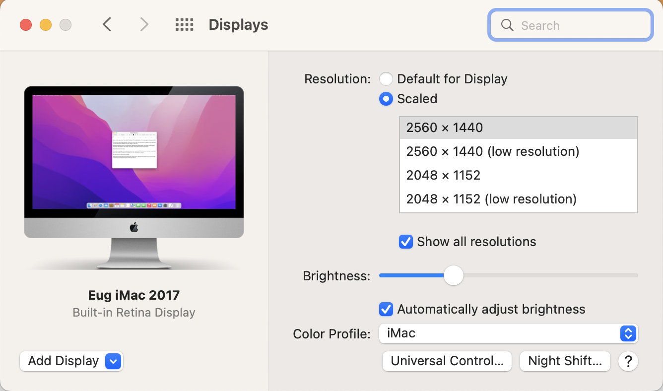 If I were to install software to run it at some intermediate resolution, are there any compatibility issues with Monterey or Ventura? Also, do you get the proper Retina scaling and not the "low resolution" type scaling? Or do you get native resolution with tiny fonts?