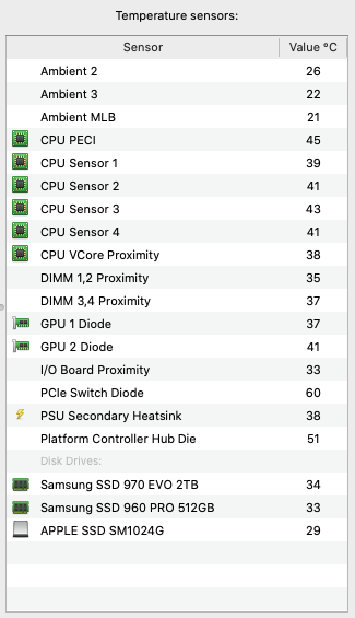 Fanny (to which I found a reference here in the forum as well) which looks way above what I would consider healthy. Unfortunately it's seldomly well-documented what sensor exactly corresponds to readouts shown by various tools. Also unfortunately, I didn't perform any pre-upgrade comparisons with all the same tools... The only direct comparison I have is what smcFanControl shows, and on that one, temps have gone down compared to before...