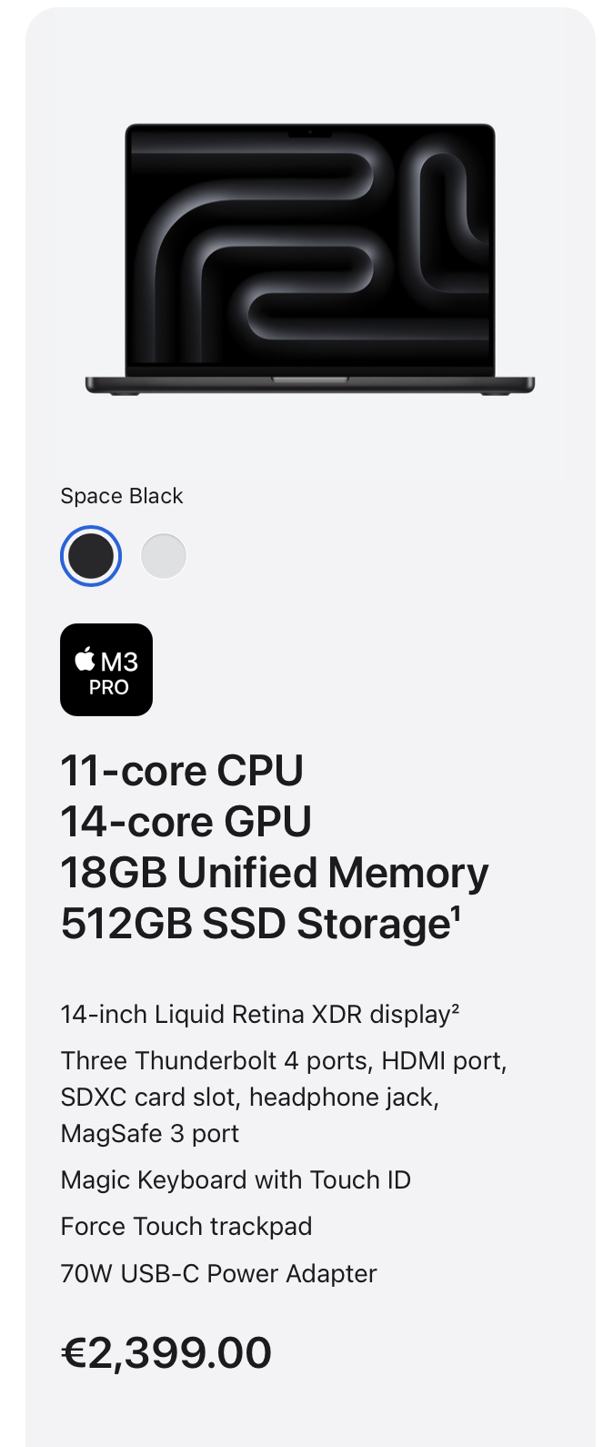 - M3Pro, 11-core CPU, 14-core GPU, 18GB Unified Memory, 512GB SSD Storage = €2,399.00