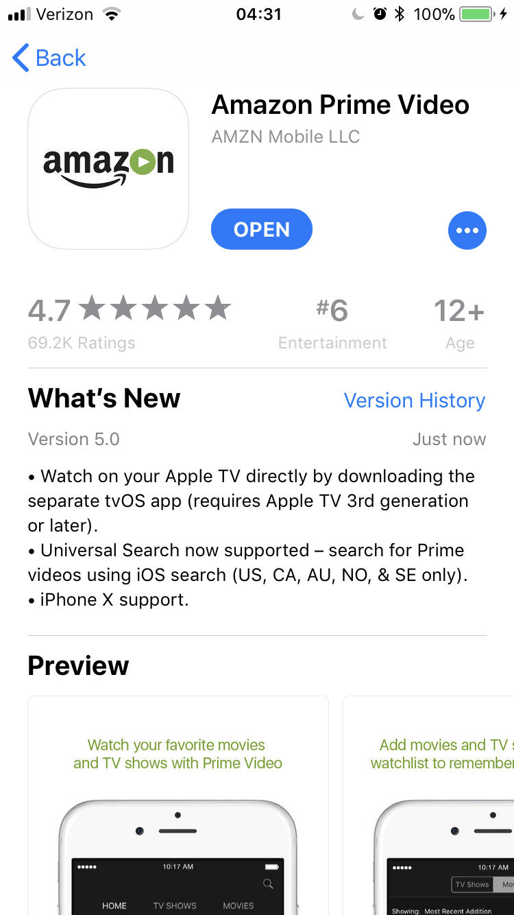 Universal Search is now supported in the updated iOS app, allowing users to search for Prime videos using the native Search function on their devices, while the app also supports iPhone X displays. The tvOS app is obviously a separate component of the installation, but Amazon Prime should be available on third-generation Apple TVs as well as fourth-gen and 4K Apple TVs, according to the release notes. We're waiting for clarification on generational support.