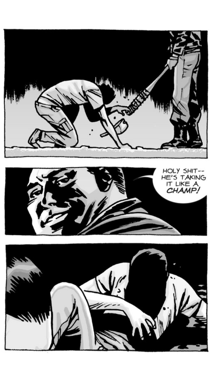 Hate to burst your bubble! That line is straight from the book and we all know who got it there.Remember when negan is using the bat and says: "you are taking it like a stud" the only 3 people to withstand that abuse would be rick, daryl or abraham cause they are the strong characters...thoughts?