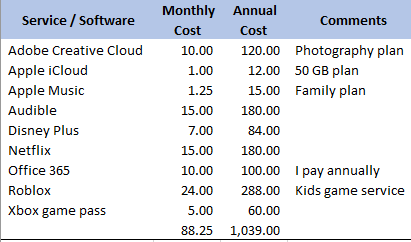 I quickly pulled together what I'm paying (putting my office subscription to good use) and I was a little shocked, that I'm shelling out over 1,000 year. Some of the subscriptions are a good value, some not so much.