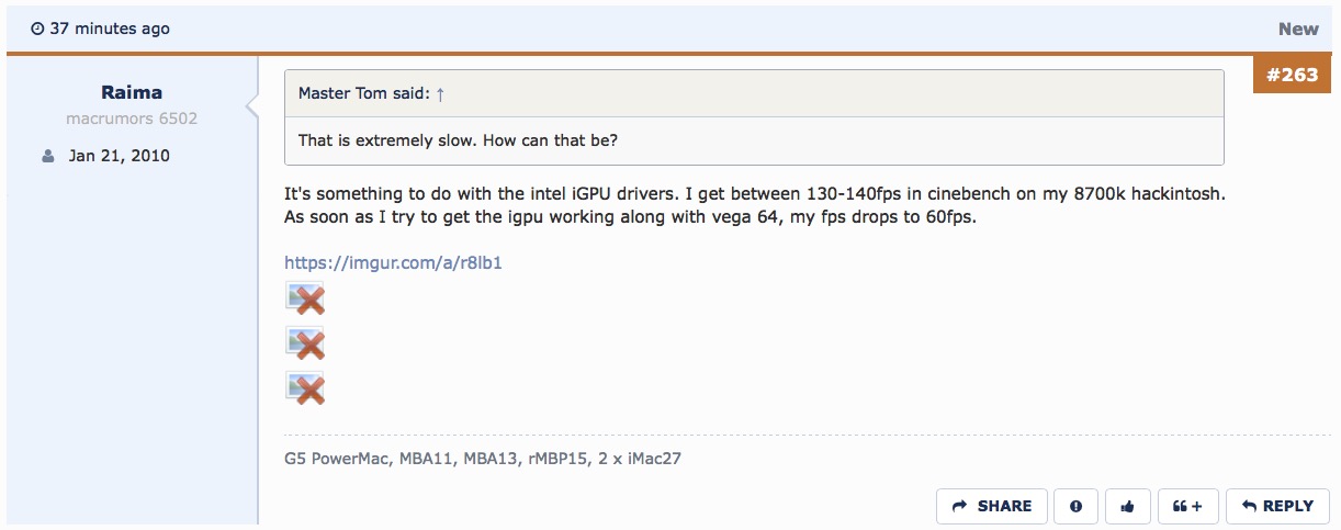 It's something to do with the intel iGPU drivers. I get between 130-140fps in cinebench on my 8700k hackintosh. As soon as I try to get the igpu working along with vega 64, my fps drops to 60fps.