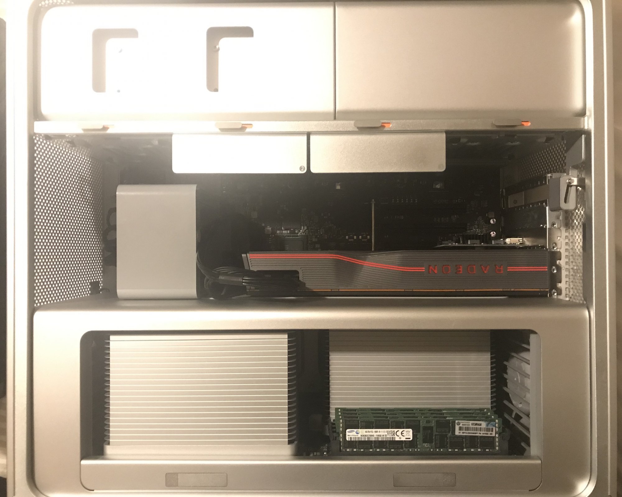 the 5700 XT card draws around 220W during high load with instantaneous peeks up to around 260W. The reference board spec for the card is 225W so I’m quite happy running it on an un-modified 5,1.