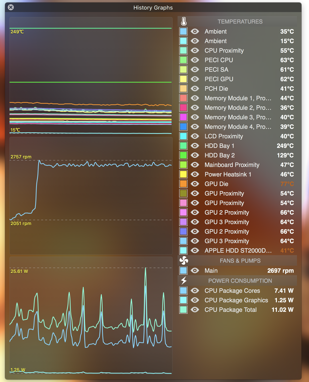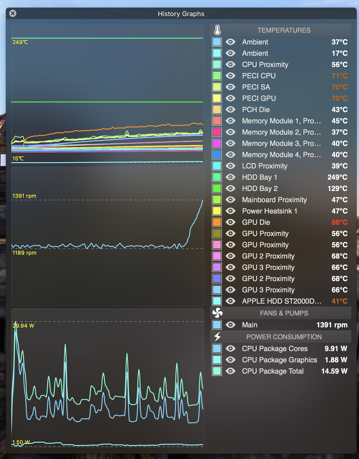 Regarding fan speed I have yet to be able to get it to go above 1800 RPM when under a load. My iMac with the m295x would hit the max fan RPM in a few seconds after starting something intensive or a game.