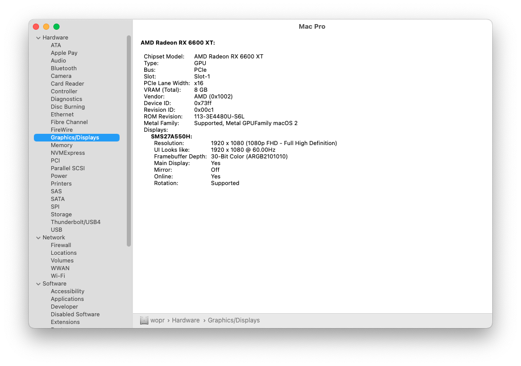 No real issues with the update/upgrade, except for the typical RTFM ones.I used my original ATI 5870 to have the boot screen when I did the OCLP macOS bump, then reverted the root patches to get the GPU acceleration working. The 6600XT BIOS patch was cake on a Windows machine. Also, no power mod is needed for this card. For now, I'm just using the 2x6-pin to 8-pin adapter I used on my 780. I have a 2x mini to 8-pin around here somewhere...