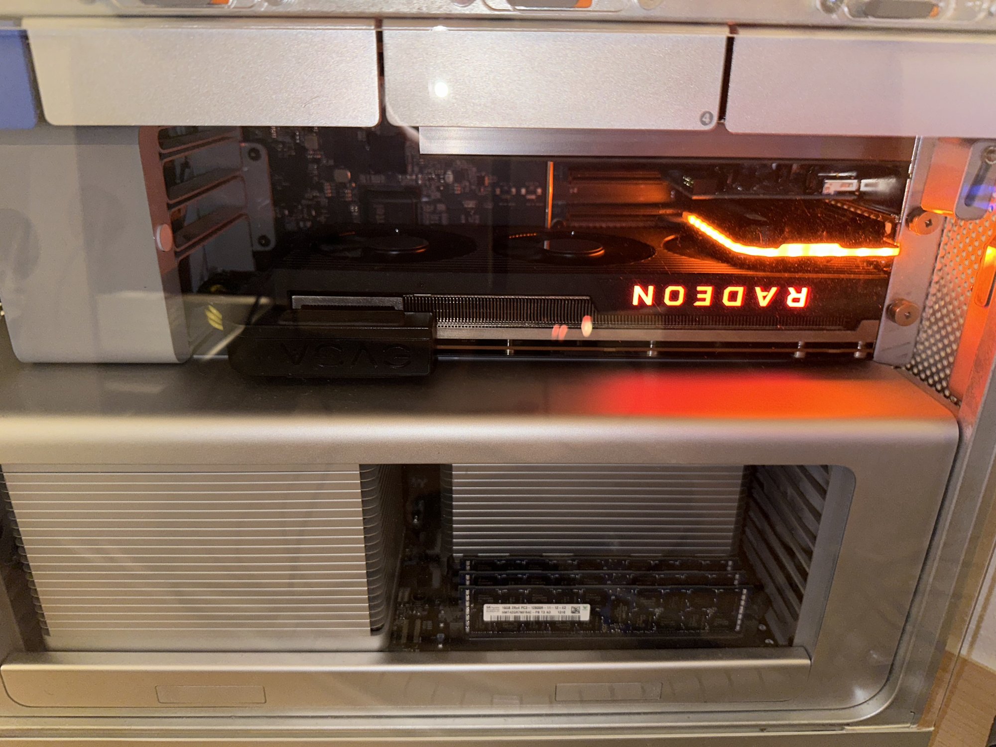 It takes a while to source one of those, but I got mine as a refurb. If you guys are unhappy with your 6600XT, I sure as hell would shoot for one of those. Because of Open core the flash is not neccesary, but the card is a real advancement over my old RX580 Seahawk. And with my old Powerlink from the golden Nvidia Web driver days, the setup is real clean and tidy. The pixlas cable is barely visible through my plexiglass cover.