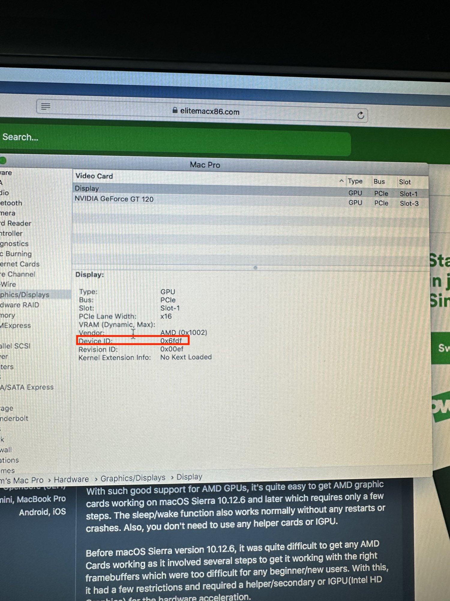 On the systems report, you see that the AMD is not being picked up and has the kernel extension “No Kext Loaded”. NOTE: I had this report on both the nitro and XFX cards.