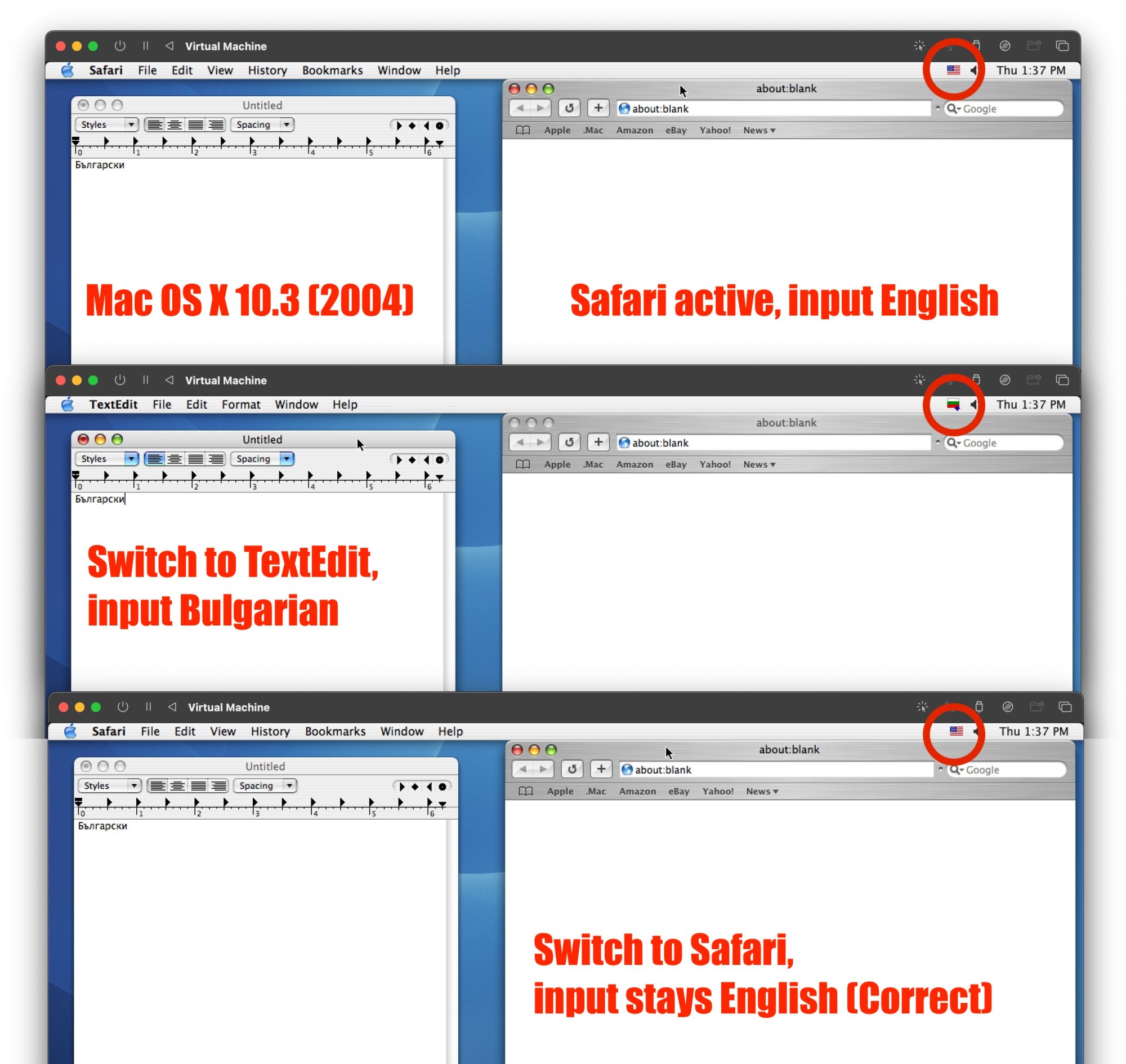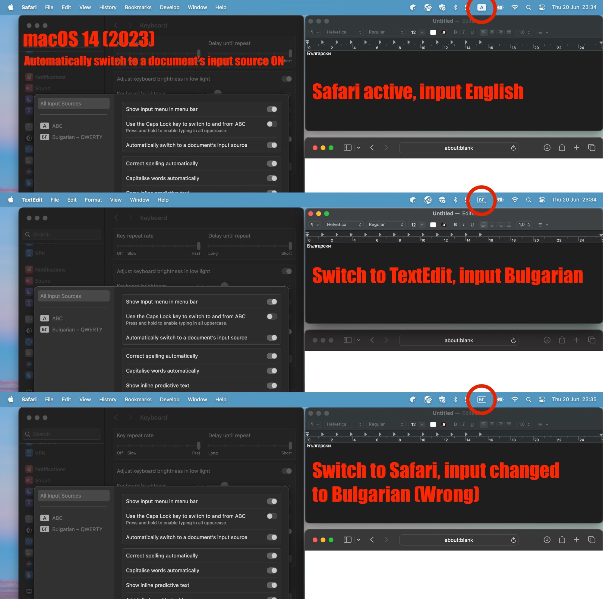 It's now 20 years since OS X 10.4 started relaying an app's input language to the next app. Input change is global. It's my only serious issue with the OS: punishing multilingual keyboard power users. It prevents me from controlling apps by keyboard, because the input language gets changed to Bulgarian whenever I switch from an app using Bulgarian. There is an option for that in the settings, it doesn't work (unless there is an text input field in focus). With a little help from AI, I created an app which restores each app's input language upon switch. It seems to work fine with some caveats, e.g. Spotlight doesn't open with the system default input, preventing me from running apps unless I switch back to English. Anyone interested to test it? Any idea how to fix the Spotlight issue too? https://gitlab.com/spacest/InputLanguageKeeper