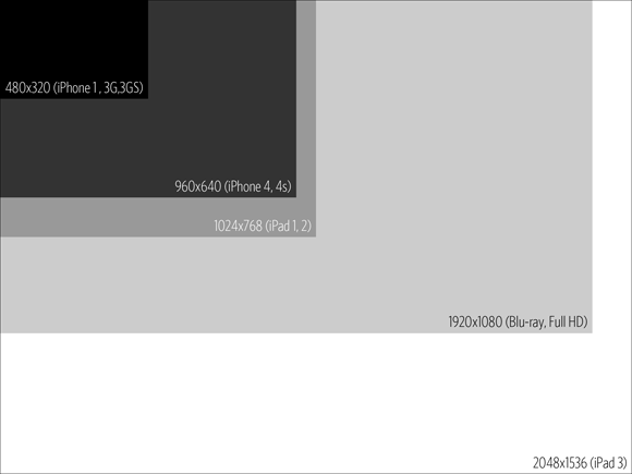 The graphic shows all screen resolutions relative to each other assuming that they all had the same DPI (dots per inch). The iPad 3 screen is actually believed to be the same physical size as the iPad 2, but carry twice the density of pixels. This should result in a much sharper images on the iPad 3 as compared to the previous models. 3rd party applications will have to be updated to support the higher resolution display and Apple is reportedly lining up demos for the March launch.
