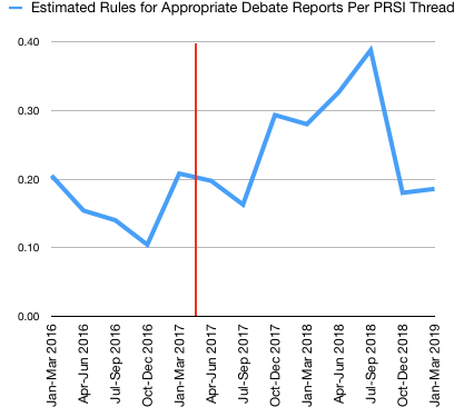 It is difficult to make any concrete conclusions from this data, as the period since the policy was enacted coincides with an unusually divisive period of US politics. This makes it hard to tease apart the effects of the policy and underlying changes in political discourse in society at large. For example, while the above graph shows a generally increasing trend in RfAD reports per thread from mid 2017 to late 2018, it's possible there could have been an even steeper trend had we not enacted the policy. Subjectively, staff have noted a lower workload from dealing with contacts regarding PRSI moderation.