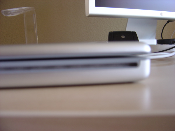 When I looked at it, it was open. I held my breath for so long. The results of the drop weren't that great, but tolerable. The edges had white areas, but thank goodness it wasn't due to the aluminum finish chipping off.. but from some white paint that I easily scraped off. I can tell the powerbook no longer lies flat cause if you press a certain corner, it'll bounce a little. If you look at the gap between the screen and the base when its closed... you can tell that one side doesn't not come down all the way.