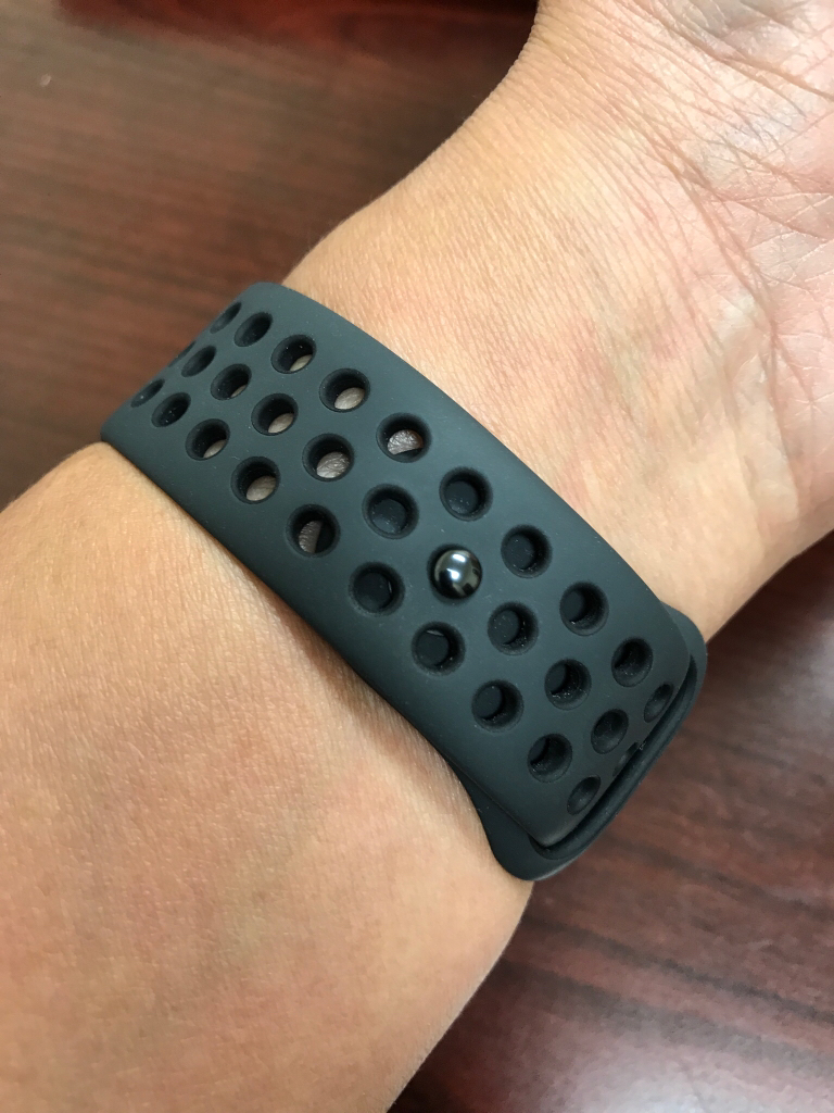 I had no intention of getting the "all black" Nike band, until I saw it up close. It reminds me of a modern interpretation of classic leather "racing" or "rallye" style watch straps (black or brown leather with patterns of holes for more airflow), and it slowly won me over.