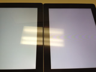 Both screen brightness are on high using the same white screen test image. The Rainbowing is more pronounced on the iPad 2 because the screen is brighter and bluer than the iPad 3. But with that much glare why not go clear?