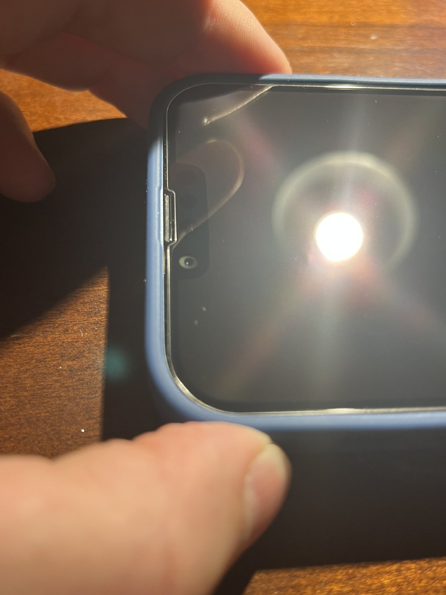 In the attached image, if you draw a horizontal line to the right from the selfie camera, it's right by the edge of the light reflection.