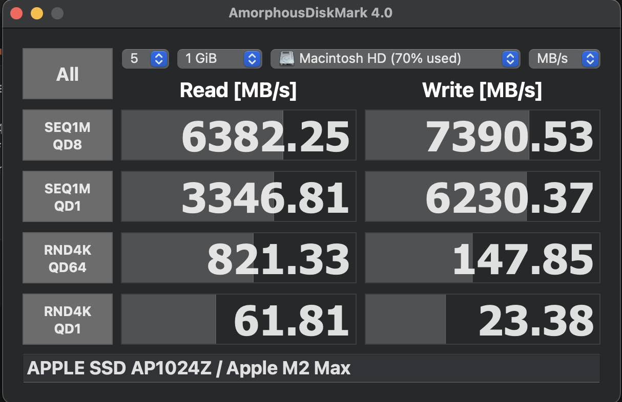 Finally, YouTuber MaxTech got 6347read/7246write for 1TB, 16” M2 Max (SEQ1M QD8) using AmorphousDiskMark. MacWorld similar. But for 14” - 6200 (M2 Pro). What do you guys think about such findings?
