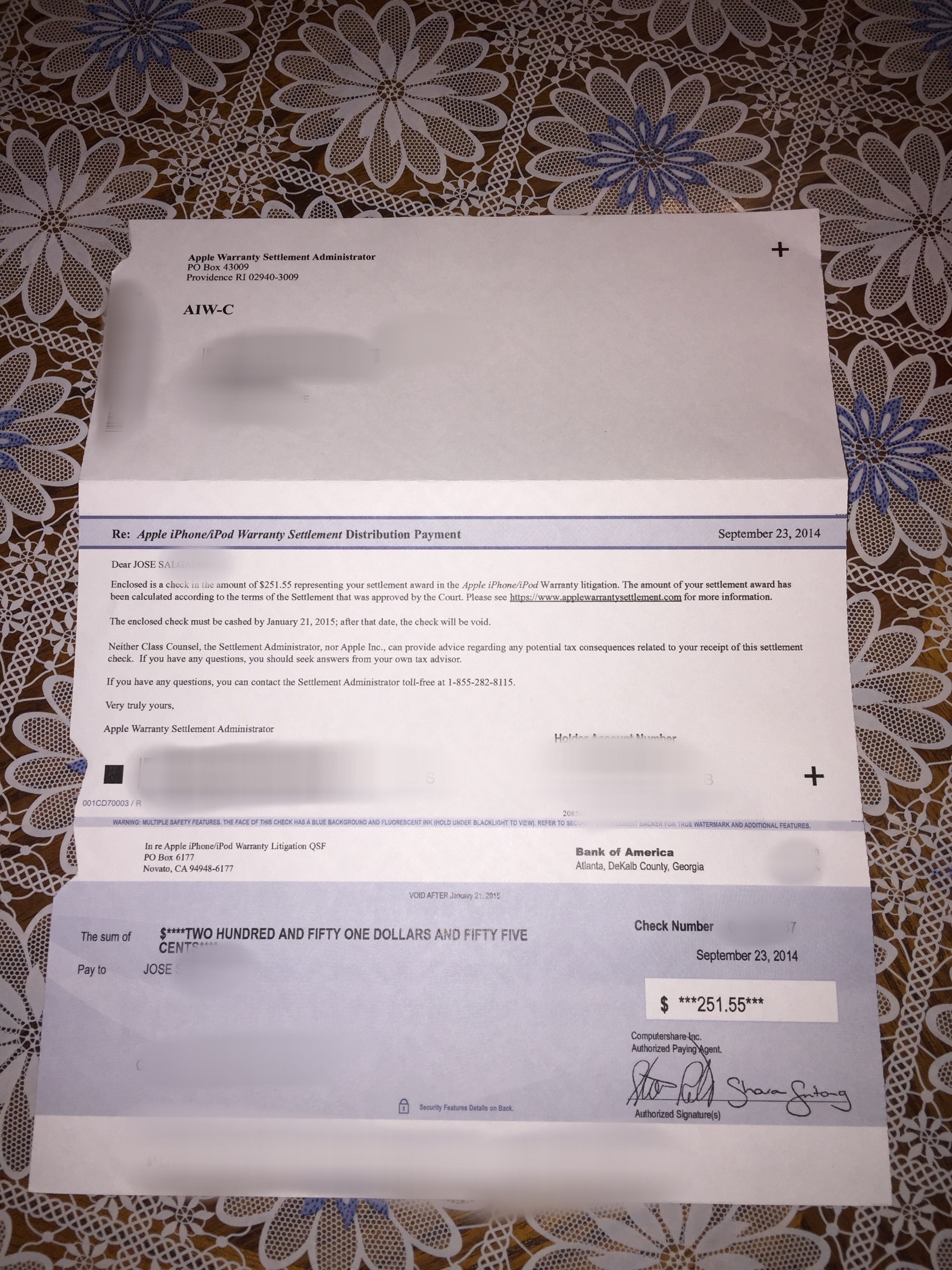 I just received a check as well but I never agreed or signed up for it at all. I do vaguely remember getting a letter but I threw it out. I get so much junk mail I just assumed that it was garbage. So I'm guess it's a legit check?