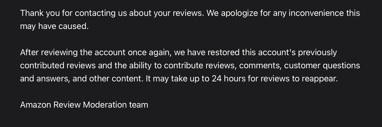 .... So even though I’ve been cleared - I haven’t been and even though I receive weekly requests from vendors to review a product Ive purchased - I can’t help them because I can no longer review anyones product on amazon.....