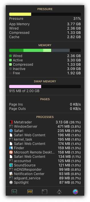 Still showing nearly 8GB free memory, so it seems odd that memory pressure is yellow. It seems to be caused by the high compressed memory usage.