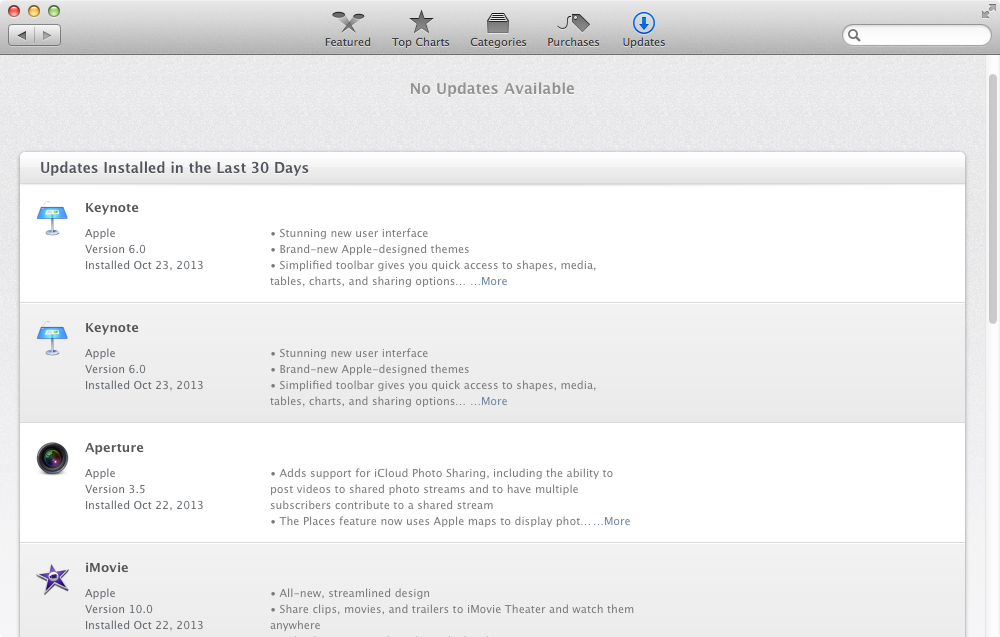Since updating to Mavericks the App Store shows I have 7 updates, including the three iWorks program, iMovie, Busy Cal 2 ,Voila, and Home Inventory. I have done all of these updates more than once now. The apps show the current version. The updates show as done in the "Updates Installed in the Last 30 Days" section. I cannot open any of my iWork programs because I get an error message saying they are being updated. I have tried restarting to no avail.