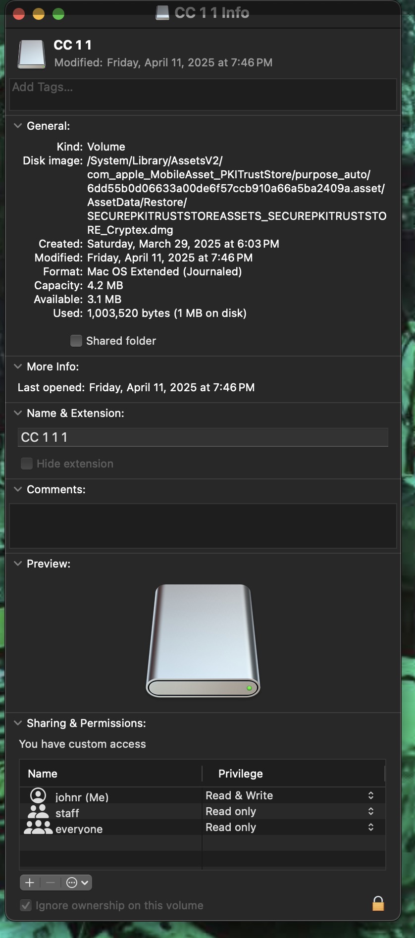 diskutil apfs list shows:| Name: Creedence11M6270.SECUREPKITRUSTSTOREASSETS_SECUREPKITRUSTSTORE_Cryptex (Case-sensitive)