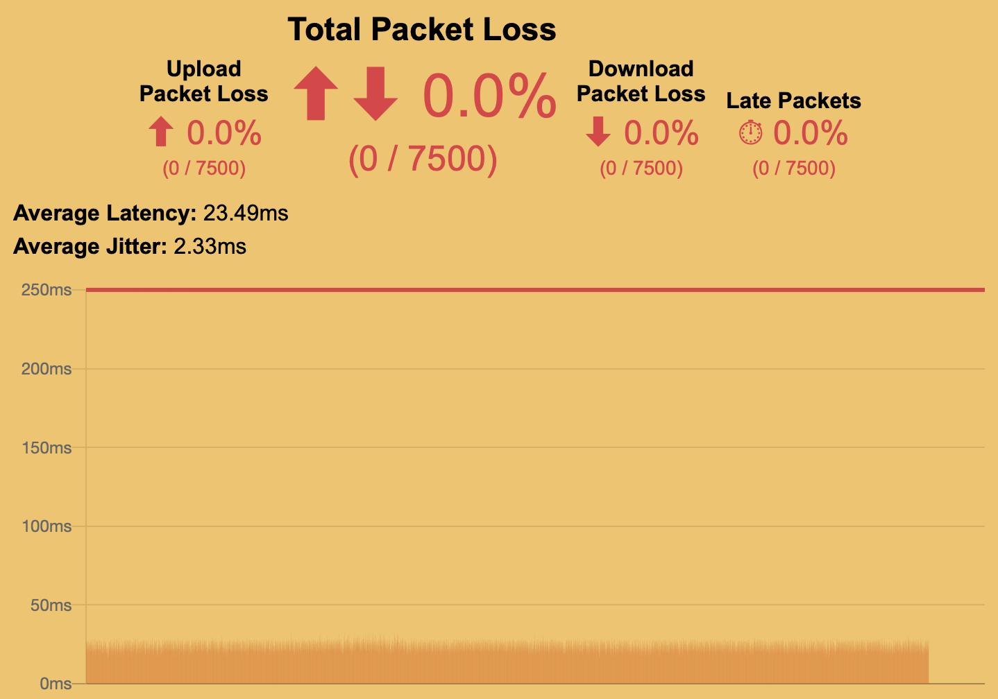 Packet loss/jitter test for 30 seconds was great - no late/dropped packets - I did the "Zoom video" config test, being more rigorous in data sent/received: