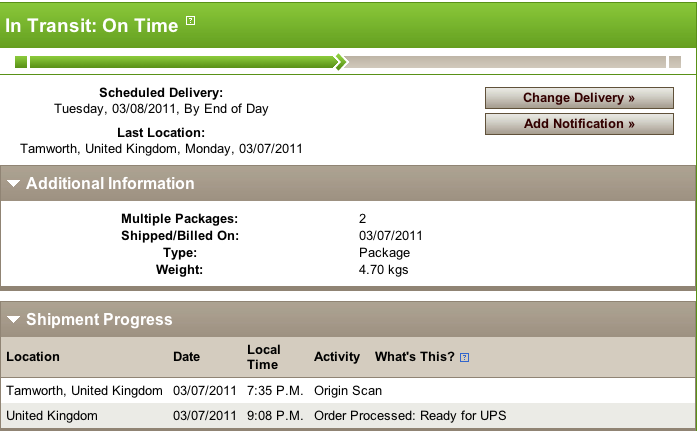 06/03/2011 14:20 Package data processed by brokerage Waiting for clearance / Released by clearing agency Now in-transit for delivery