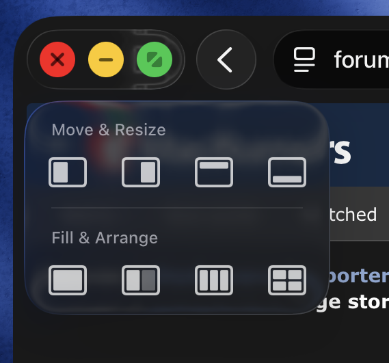 Similar to macOS if y’all used your iPad together with your Mac.Here's another way I've just discovered (and probably the best method). Tap and hold the traffic light buttons for quick access to the tiling/split screen options.