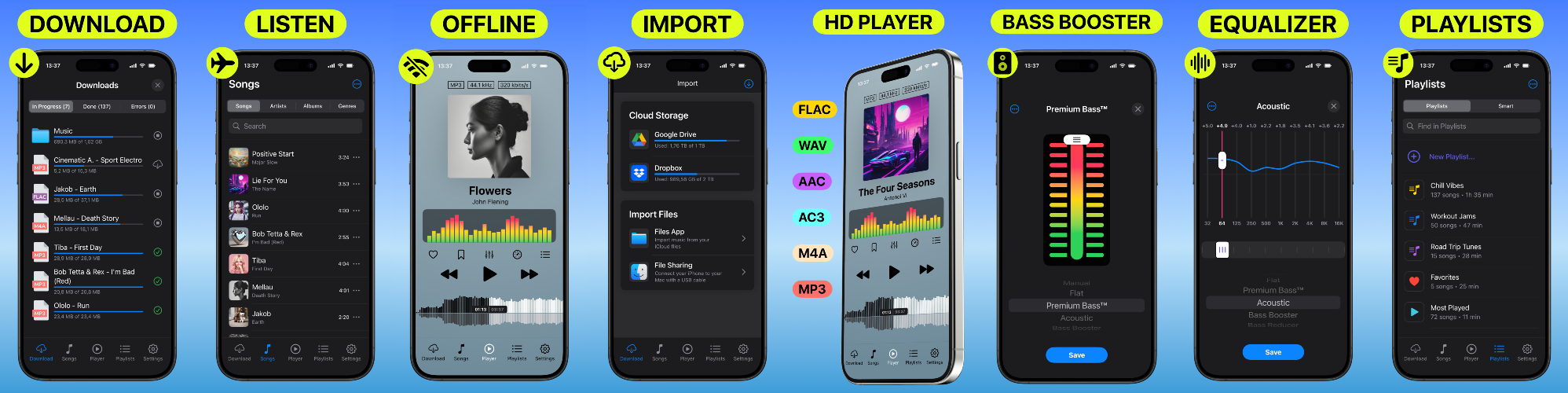 • Listen anytime, anywhere: Your music, offline, no internet required.• Seamless Music Import: From Files, Dropbox, Google Drive, and more to come
