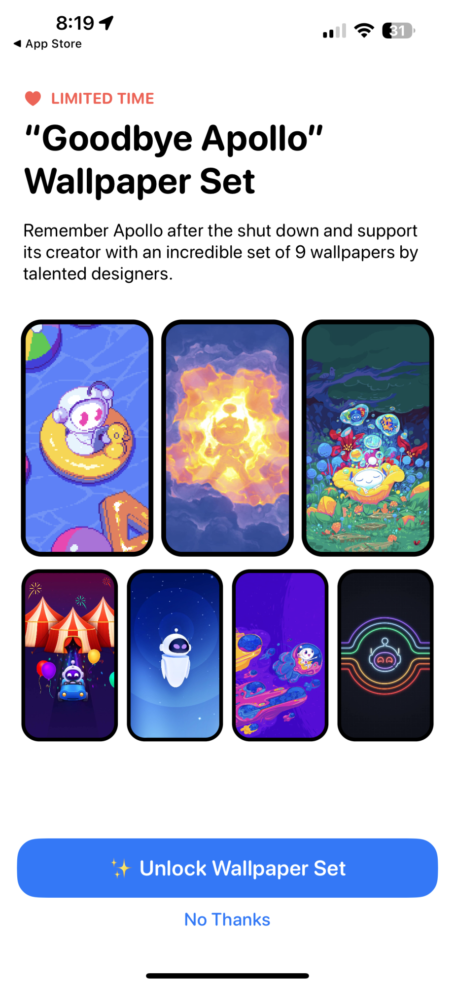 The latest version of Apollo also includes a new "Goodbye Apollo" wallpaper pack that can be unlocked with a donation, which Selig said will help with refund costs.